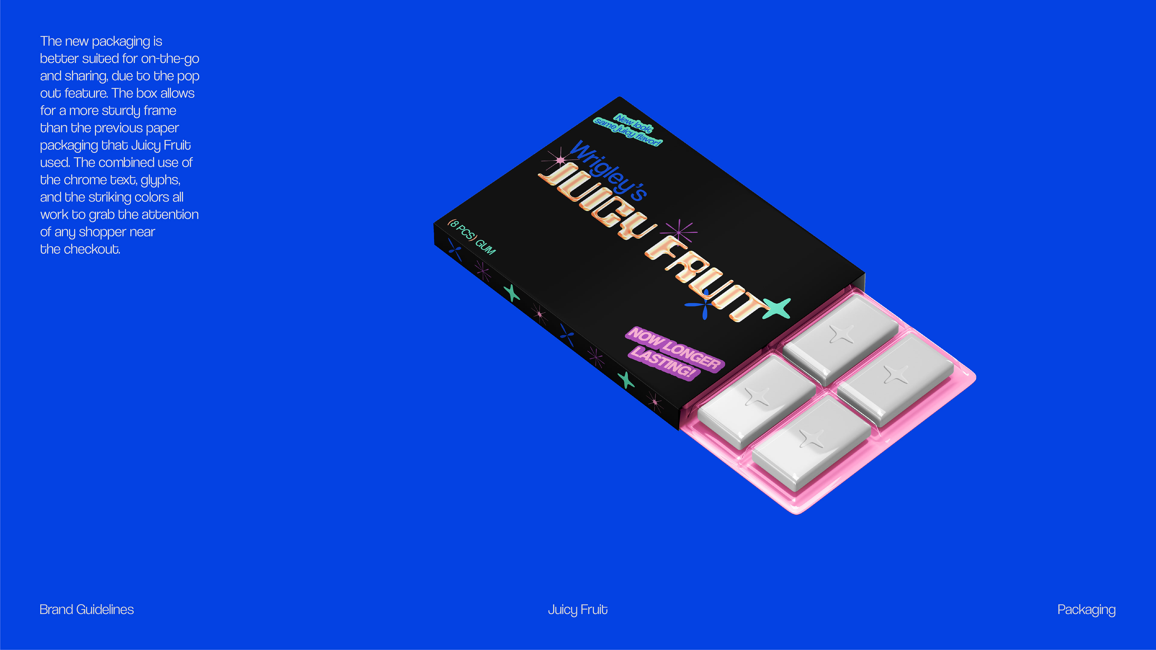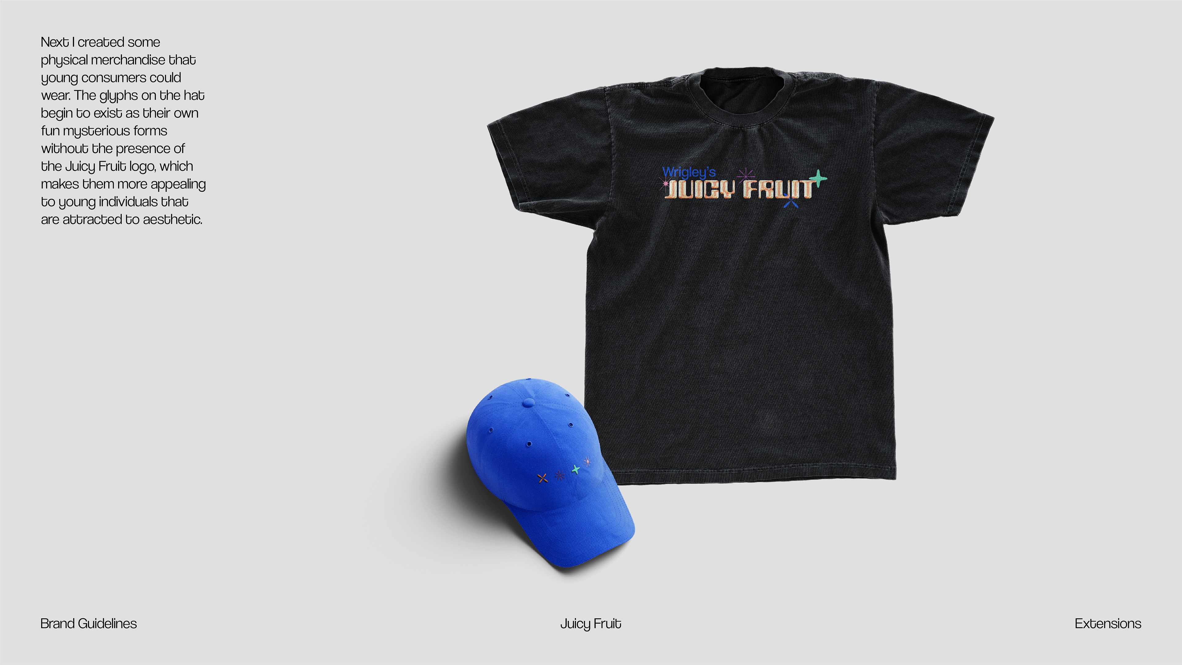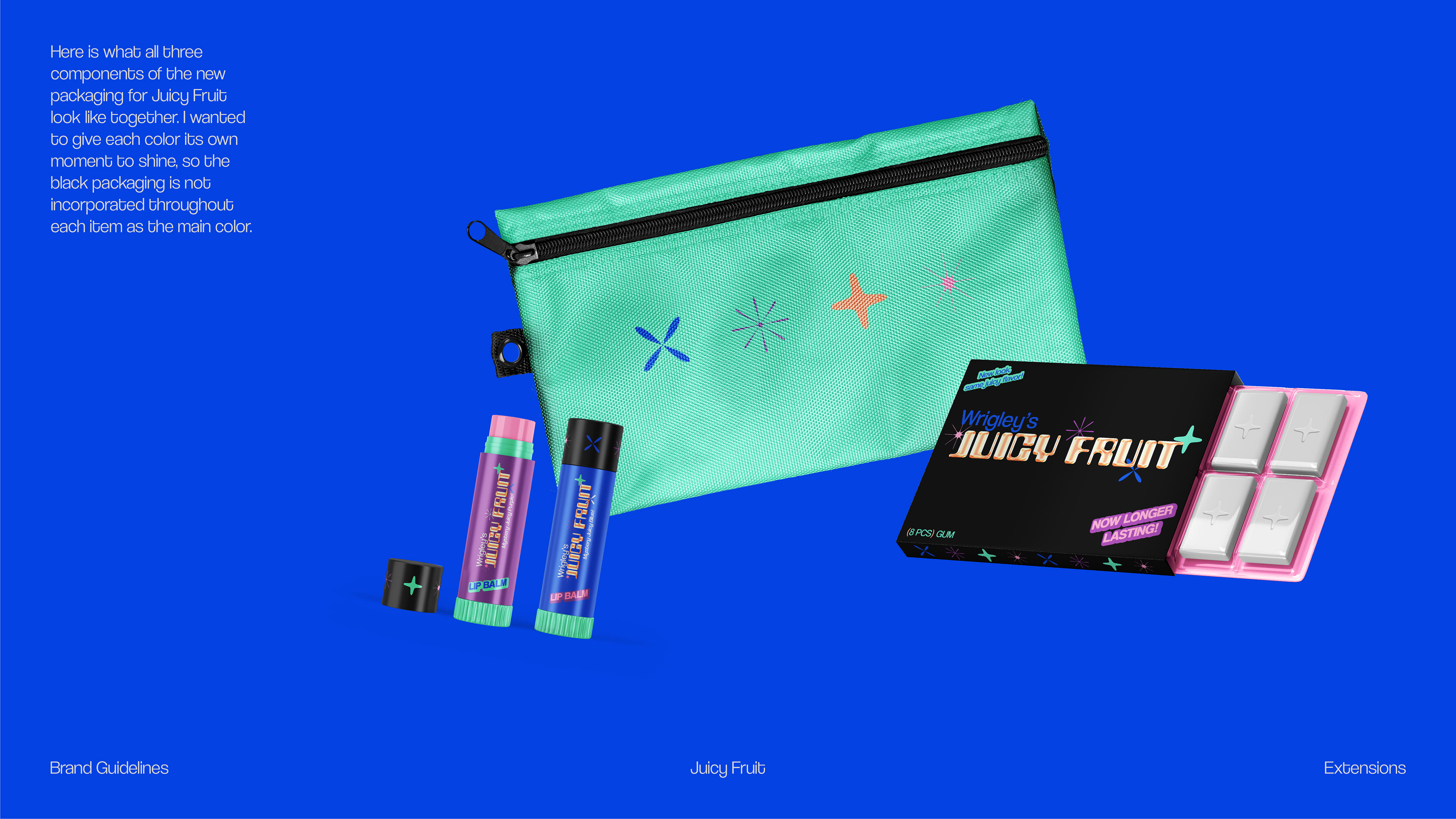 A flavorful new rebrand for Wrigley's Juicy Fruit packaging and extended merchandise. The goal of this project was to increase the relevancy of the product through aesthetic transformation to attract the attention of young consumers.